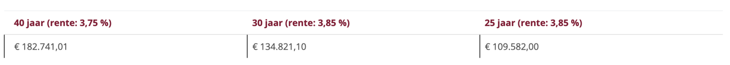 Hieronder een voorbeeld. U merkt dat voor hetzelfde geleende bedrag de maandlast aanzienlijk stijgt bij een kortere looptijd.