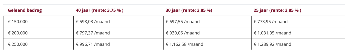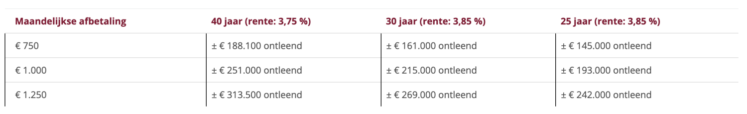 In de tabel hieronder vindt u enkele voorbeelden (met een vaste rente). Bij een korte looptijd, kunt u minder lenen als u uw lasten lager wil houden.